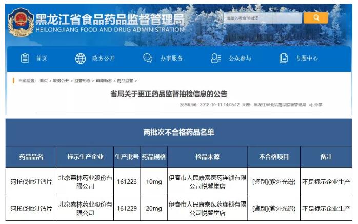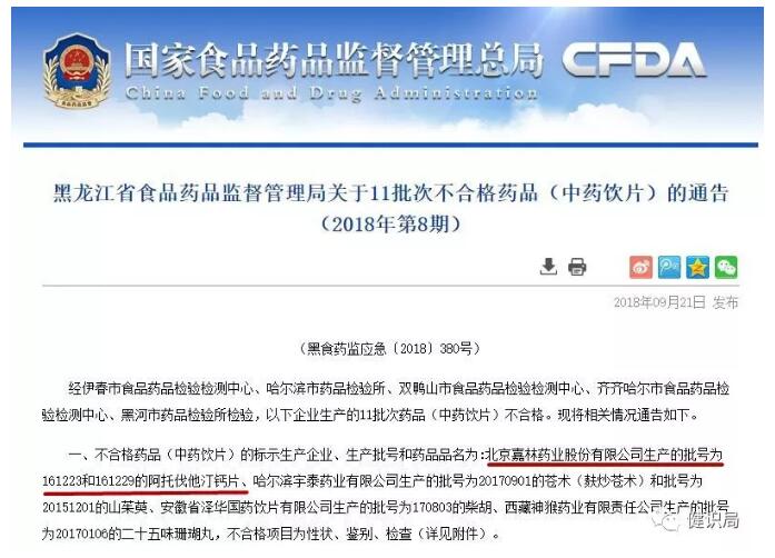 9月21日,黑龙江食药监局发布公告称,已检查出有11批次药品(中药饮片)不合格。其中就包括北京嘉林药业股份有限公司生产的批号为161223和161229的阿托伐他汀钙片。