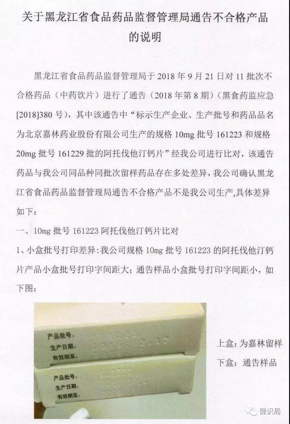 最终结论就是:黑龙江药监局公示的不合格阿托伐他汀钙片批次与公司同品种同批次留样药品存在多处差异,确认通告中所涉及的不合格产品不是公司生产。
