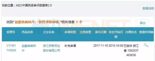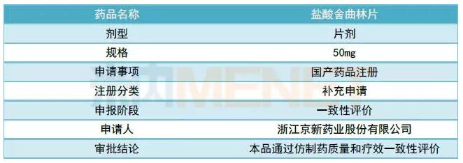 10月11日,京新药业发布公告,称于近日收到国家药监局核准签发的化学药品“盐酸舍曲林片”的《药品补充申请批件》,该药品通过仿制药一致性评价。据米内网数据显示,2017年在中国城市公立医院、县级公立医院、城市社区中心及乡镇卫生院(简称中国公立医疗机构)终端抗抑郁药产品TOP20中,盐酸舍曲林片以8.46亿元的销售额排名第三,市场主要领军企业为辉瑞。数据显示,盐酸舍曲林片的一致性评价申请且通过的企业仅有京新药业。