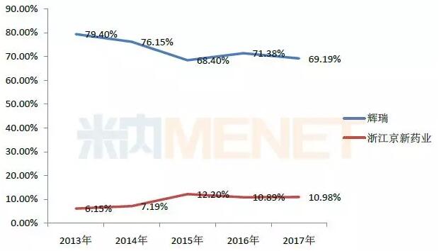 图2:2013-2017年在中国公立医疗机构终端盐酸舍曲林片市场份额超过10%企业情况