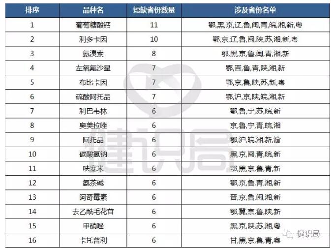 从短缺药品涉及的区域范围来看,有16个药品涉及短缺的省份在6个以上