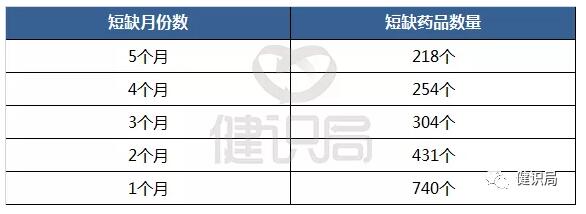 从短缺药品涉及的时间范围来看,有218个药品连续5个月出现在短缺监测报告中(药品详单可翻至文末查阅),有254个药品至少在5个月中的4个月监测到到短缺,有3个月短缺的药品数量304个,还有近1200个药品又1-2个月监测到短缺