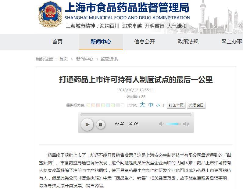 文章称,上海市食药监局通过调研发现,目前,一些药物研发型企业面临着这样的困难:药品上市许可持有人制度改革解除了注册与生产的捆绑,使不具备药品生产条件的研发企业也可以成为药品上市许可的持有人,但是此类公司《营业执照》中无“药品生产、销售”相关经营范围,故不能变更税务登记事项,最终导致无法开具发票、销售药品。