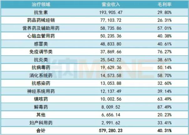 表1:2017年辅仁药业各治疗领域的营收情况(单位:万元)