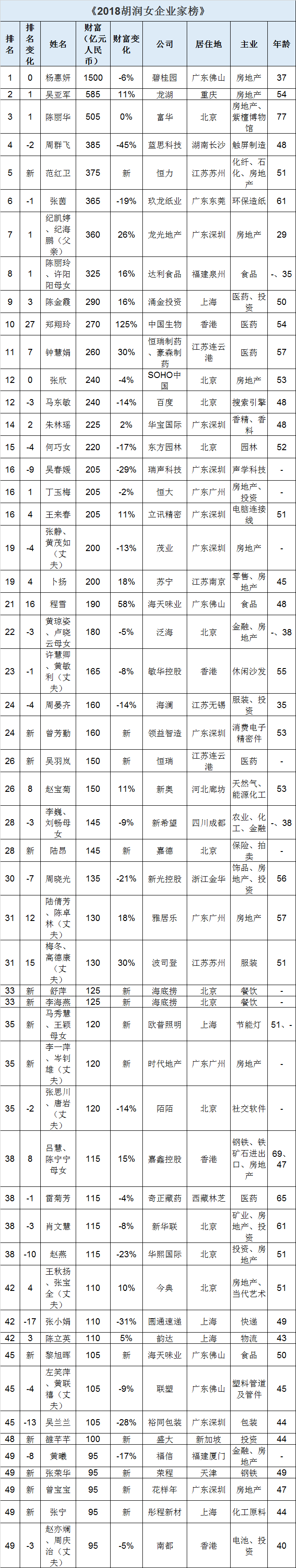 10月16日,胡润研究院发布《2018胡润女企业家榜》,这是胡润研究院连续第13次发布“胡润女企业家榜”前50名,其中碧桂园37岁杨惠妍财富缩水100亿,但仍以1500亿财富值第六次成为中国女首富;54岁吴亚军以585亿元位居第二,也是唯一进入胡润百富榜前50名的中国白手起家女企业家。据统计,榜单中来自医药行业的女企业家共有4位,分别是中国生物的郑翔玲,恒瑞、豪森生物的钟慧娟,恒瑞的吴羽岚(新上榜),以及奇正藏药的雷菊芳。