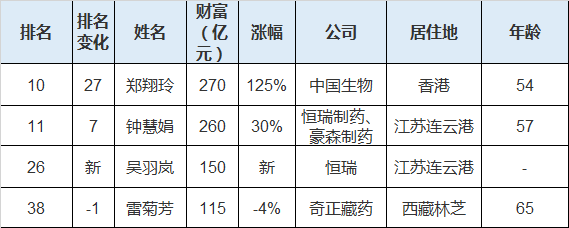 据统计,今年医药及医药投资行业上榜人数共有4人,财富总额为795亿元。医药界中排在最前的是郑翔玲,54岁,陕西人,财富上涨一倍多至270亿元,排名比去年上升27位至第十;排在第二的是豪森生物的钟慧娟,财富为260亿元;排名第三的吴羽岚目前任职于恒瑞,也是新进榜的医药界女企业家,财富为150亿元。而在此前发布的医药医疗类的胡润百富榜上,郑翔玲和谢炳共同财富排在第二位,吴羽岚和雷菊芳则分别排在第25和28位。