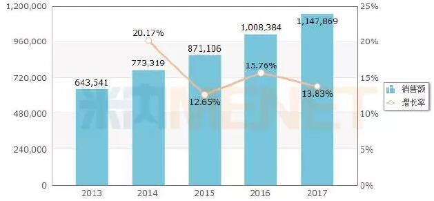 图2:2013-2017年中国公立医疗机构终端硫酸氢氯吡格雷片的销售情况(单位:万元)