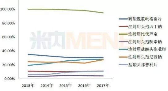 此外,市场份额在20%以上的产品还有全身用抗细菌药注射用盐酸头孢吡肟、注射用头孢尼西钠,注射用盐酸头孢吡肟的市场份额由2013年的19.29%上涨至2017年的28.02%,注射用头孢尼西钠的市场份额由2013年的24.46%上涨至2017年的27.43%。