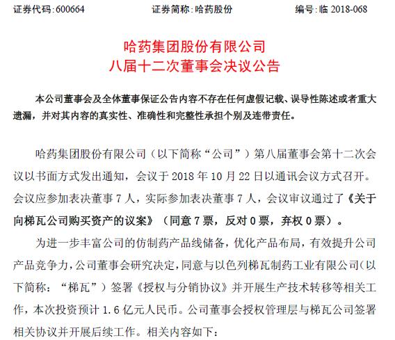 昨日(10月23日),哈药集团发布公告称,为进一步丰富公司的仿制药产品线储备,优化产品布局,有效提升公司产品竞争力,公司董事会研究决定,同意与以色列梯瓦制药工业有限公司(以下简称:“梯瓦”)签署《授权与分销协议》并开展生产技术转移等相关工作,本次投资预计1.6亿元人民币。