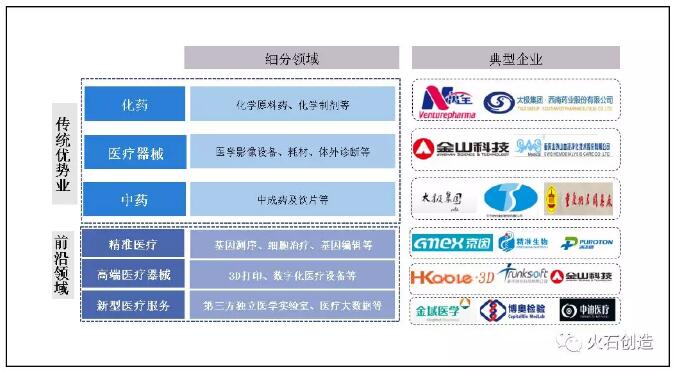 目前重庆市除了具有基础优势的化药、中药、医疗器械等传统产业之外,正积极布局特色医疗器械如基因检测、前沿生物技术领域如精准生物干细胞等未来产业。形成了以大渡口为代表的精准治疗(重点发展基因测序、细胞治疗、基因编辑等前沿技术)、体外诊断试剂与设备(重点发展核酸扩增(PCR)、基因芯片)等的体外诊断特色产业集聚区;以高新区为代表的基因测序、医疗大数据、数字化医疗设备等的生物医药高新产业;以巴南为代表的单抗药物、3D打印等的符合前沿技术发展趋势的产业。