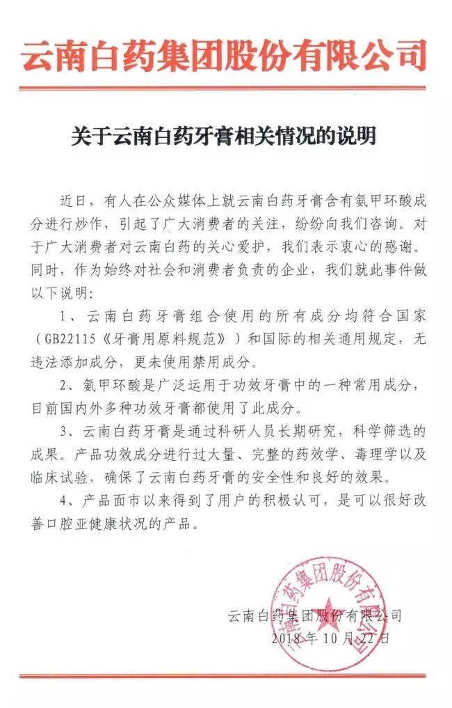 迫于网络舆论的压力,于23日上午,云南白药官方网站发布了一条情况说明称,氨甲环酸是广泛用于功效牙膏的一种常用成分,国内外多种功效牙膏都使用了此成分。并表示,云南白药牙膏使用成分均符合国家和国际规定,无违法添加成分,更未使用禁用成分。