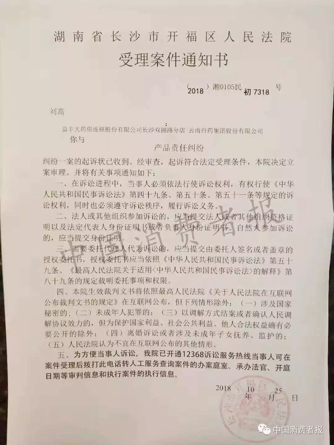 10月25日上午,湖南长沙一消费者将云南白药告上了法院。长沙市开福区人民法院正式受理了该起诉。