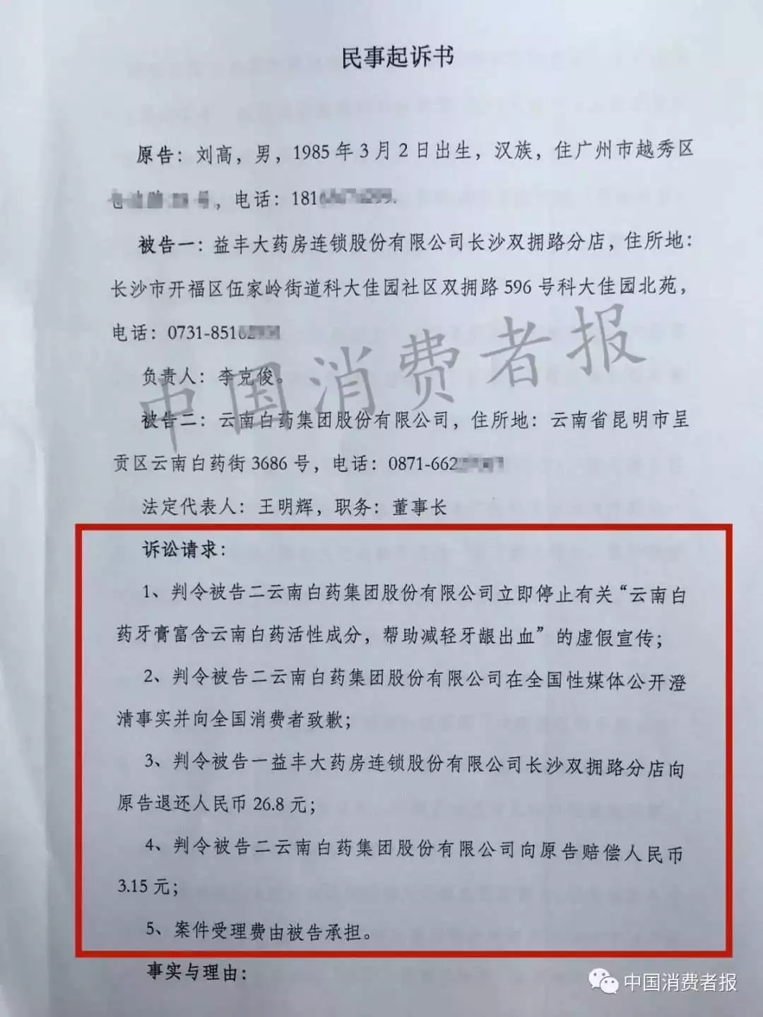 据中国消费者报报道,该报记者作为唯一媒体见证了消费者起诉的全过程。起诉云南白药集团的消费者名叫刘高,是长沙一名知名职业律师。