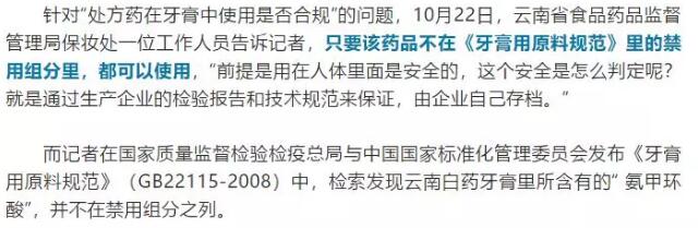 事件发生后,北京青年报一篇《牙膏里有处方药?云南白药牙膏还能用吗?回应来了》的文章对此进行了解读。(以下图片截取至人民日报微信或网络)
