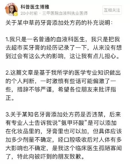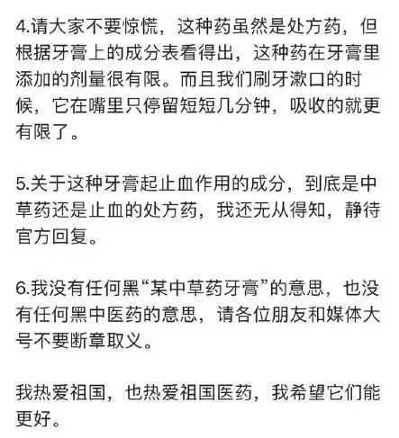 另外,爆料医生也发文表示,自己只是一名普通的血液科医生,把自己去超市买牙膏的经历记录了一下,基于自己所学的专业知识做出的个人判断,可能有些偏激,并没有“黑某中草药牙膏”的意思。