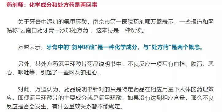 10月21日,今日头条自媒体用户认证为三甲医院血液科执业医师的@科普医生博雅称,她在“YN白药”牙膏成分中发现了氨甲环酸,而这是血液科医生常用的止血药,并且还是处方药。