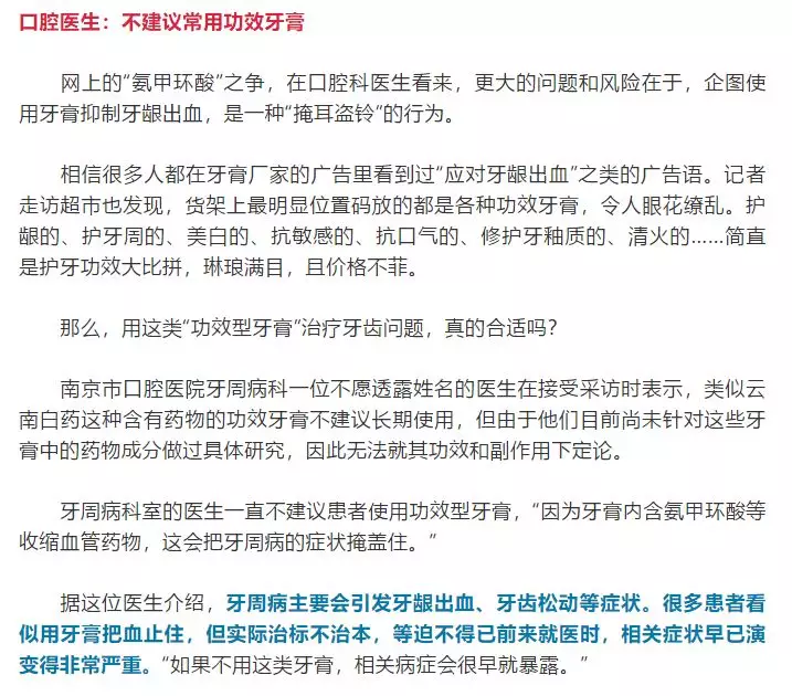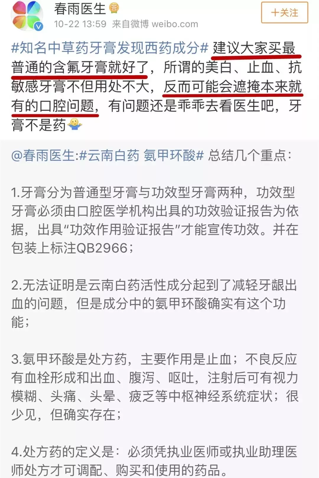 对于云南白药牙膏中添加西药止血成分,该医生提出两点质疑:第一,牙膏是日用品,居然含有血液科医生常用的止血药——氨甲环酸(处方药)。第二,很多号称防止牙龈出血的牙膏里都含有氨甲环酸,事实上是挂羊头卖狗肉,起作用的是氨甲环酸。
