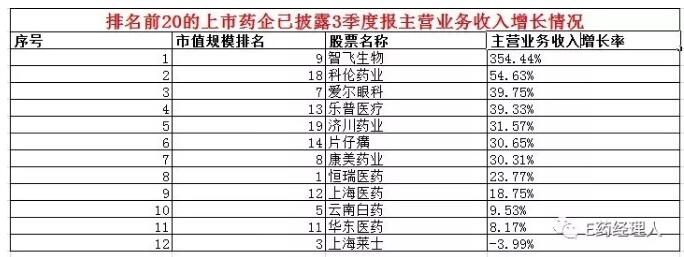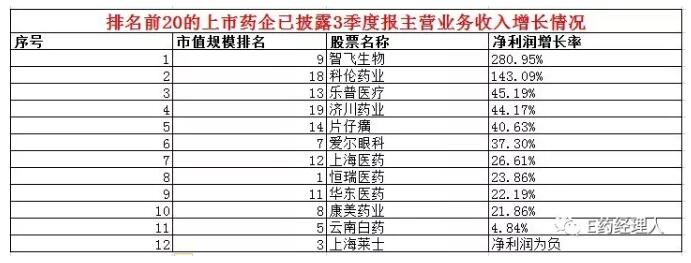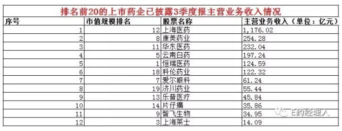 已经披露3季度报业绩的药企业务收入及盈利情况如何?增长情况如何?E药经理人对已经披露业绩市值排名前20的上市医药企业的前三季度业绩情况进行了盘点和分析。