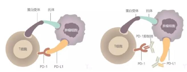 那么PD-1究竟是什么?PD-1的全称是程序性细胞死亡受体蛋白1(Programmed cell death protein 1),是一种位于T细胞表面、进行免疫调节的蛋白质受体,当肿瘤细胞表面的PD-1受体与配体PD-L1相结合时,T细胞的免疫功能就会被关闭,导致肿瘤细胞无法被杀死。目前对这一免疫过程进行抑制的药物有两种,一种是抗PD-1抗体,另一种是抗PD-L1抗体,通过抑制PD-1和PD-L1的结合,从而激活T细胞的功能,使其杀死肿瘤细胞。