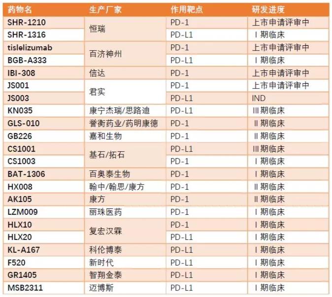 与已上市的PD-1抑制剂相比,未上市药物的竞争更为激烈,仅在国内处于临床阶段的就有20余种。去年底,信达生物提交的信迪单抗注射液的上市申请(CXSS1700038)获得CDE承办受理,是首个国产PD-1抑制剂上市申请。截止目前,处于国内PD-1抑制剂研发第一梯队的4个厂家(恒瑞、百济神州、信达、君实)都已递交上市申请,国产PD-1最快有望于今年下半年问世。