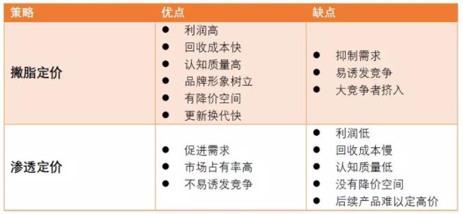 1)撇脂定价:即高价策略,在新药上市之初,尽量把价格定高,以便在短期内获取高额利润,回收投资,以后再根据产品的生命周期变化分阶段降价。使用这种定价规则一般来说要满足市场有足够的购买者、高价带来的数量减少不抵消利益以及竞争者少的条件。