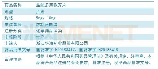 2017年3月31日,公司就该药品首次向浙江省食品药品监督管理局提交注册申请并获得受理(受理号:CYHS1700084、CYHS1700085);2017年12月18日,国家食品药品监督管理总局药品审评中心发布《拟纳入优先审评程序药品注册申请的公示》(第二十五批),将盐酸多奈哌齐片纳入优先审评药品注册程序并予以公示;近日,公司收到国家药监局核准并签发的盐酸多奈哌齐片《药品注册批件》。