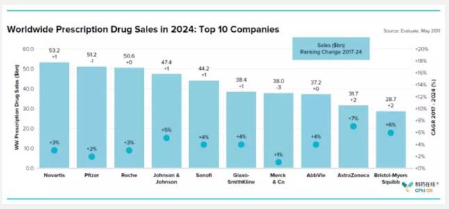 EvaluatePharma预测,2024年诺华将问鼎处方药销售Top1,销售额为532亿美元,辉瑞和罗氏紧随其后,相比2017年,辉瑞下降1位,屈居第二。