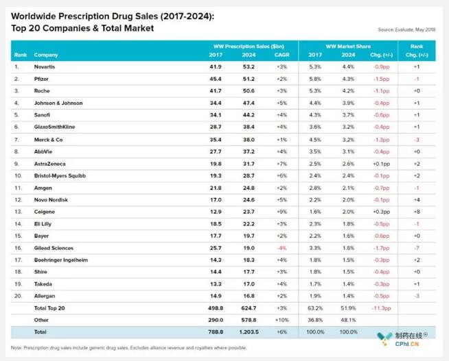 值得注意的是,如果武田预期完成对shire收购,合并后的实体将进入前十。