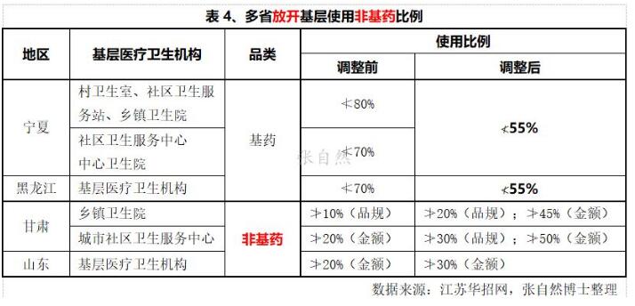 因基层医疗机构承接分级诊疗转来的复杂患者需要、屡被招标降价等多种原因,基药目录使用比例的限制逐渐被打破、企业的积极性也屡受重创,如宁夏对村卫生室基药配比的要求已由原先的不少于80%放宽到了不少于55%,山东对基层医疗机构非基药的配备比例的要求也由原来的不高于20%提升到了不高于30%。