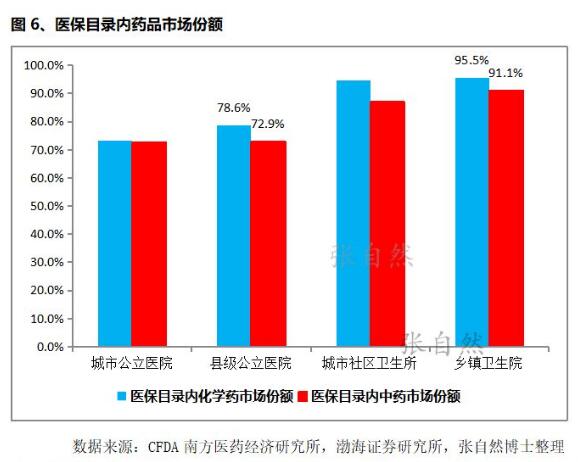 由图6可见,不进医保目录对药品的使用和销量影响之大,因中国的药品使用对医保有高度的依赖性, 如乡镇卫生院的医保目录内化药市场份额占到了95.5%、中药占到了91.1%。