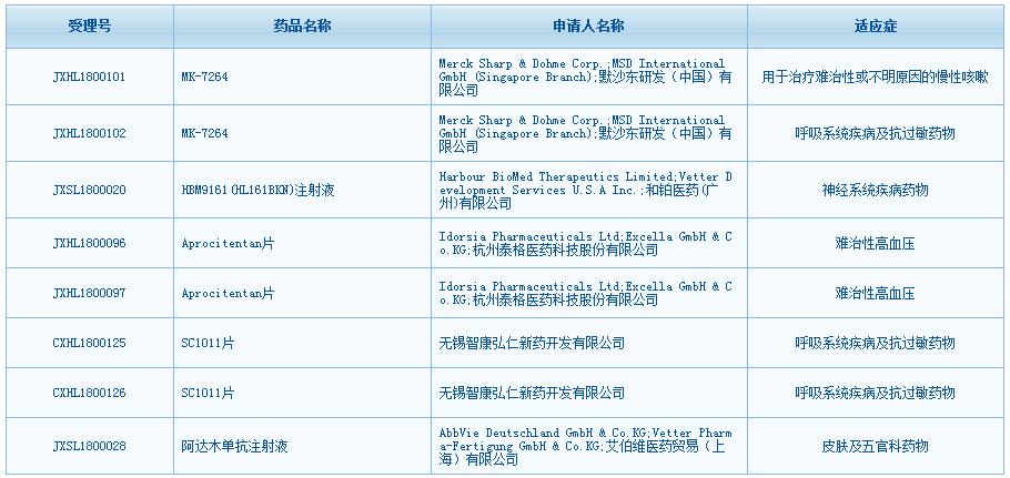 点击进入该栏目后,可以看到首批公示的8个受理号获得默许,其中包括有来自默沙东研发(中国)有限公司用于治疗难治性或不明原因的慢性咳嗽和呼吸系统疾病及抗过敏药物MK-7264、艾伯维医药贸易(上海)有限公司神经系统疾病药物HBM9161(HL161BKN)注射液等跨国药企的注册申请,也有来自杭州泰格、和铂医药等国内创新药企业的申请。