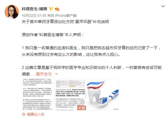10月21日,身份认证为“三甲医院血液科执业医师”的@科普医生博雅(以下称为博雅)发文称,某知名中草药牙膏的主要成分中含有氨甲环酸,这种药物主要作用是止血凝血,也就是说,该款牙膏的止血功能是因为加入了西药成分,这是血液科医生常用的止血药,并且还是处方药。文中提到的“YN白药”随后就被直指为云南白药牙膏。