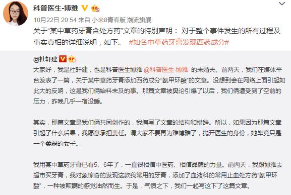 也就在同一天,博雅的未婚夫、微博用户“杜轩建”也发了一篇置顶长文,文中表示那篇文章是他和博雅共同创作,并承认文章是在气愤心情下创作的,可能措辞偏激了一些,带有负面情绪,但并没有在文中辱骂、攻击、诽谤任何组织和企业,仅仅是在自己专业范围和认知能力之下,对某些牙膏中的成分产生了质疑。