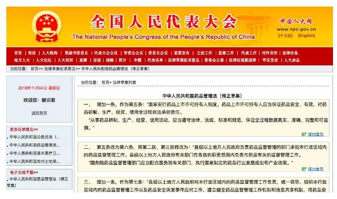 日前(11月1日),中国人大网公布《药品管理法(修正草案)》全文,并于11月1日至12月1日期间征求各界意见。