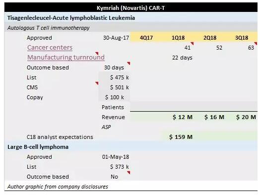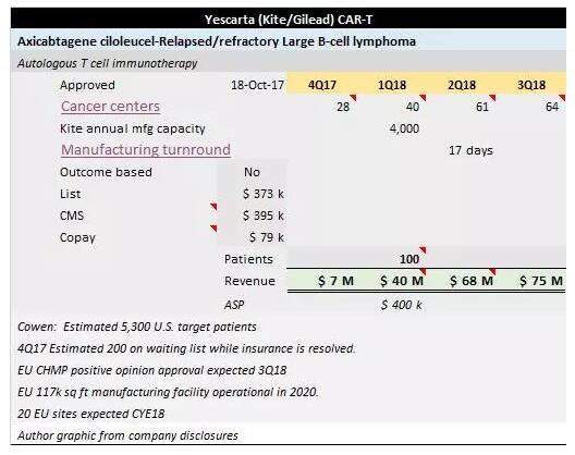 以诺华和吉利德这两家进入商业化阶段的公司为例,它们正聚焦于治疗中心的覆盖范围和制造能力。截止到2018年9月30日,已经有63个癌症中心使用Kymriah,64个癌症中心使用Yescarta。