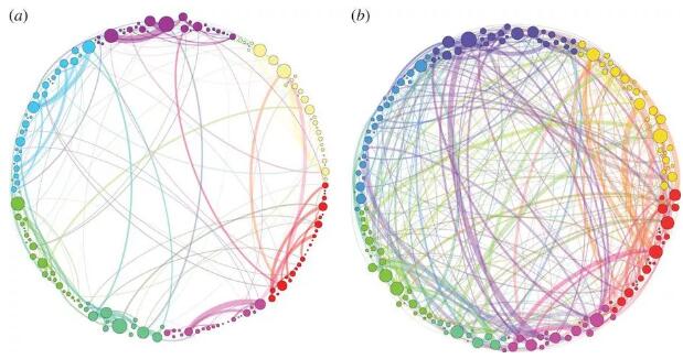 这张图片摘自《英国皇家学会界面杂志》在2014年发表的一项研究,图片左边展示的是摄入安慰剂的人脑,右边展示的是摄入裸盖菇素的人脑。