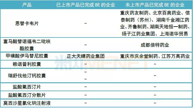 表2:8个未有企业通过一致性评价的产品已完成BE情况