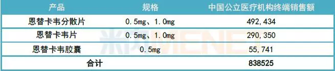据米内网数据显示,2017年在中国城市公立医院、县级公立医院、城市社区中心及乡镇卫生院(简称中国公立医疗机构)终端全身用抗病毒药产品TOP20中,恩替卡韦分散片排名第一,恩替卡韦片排名第二,恩替卡韦胶囊排名十一,三个产品合计终端销售额超过了83亿元。