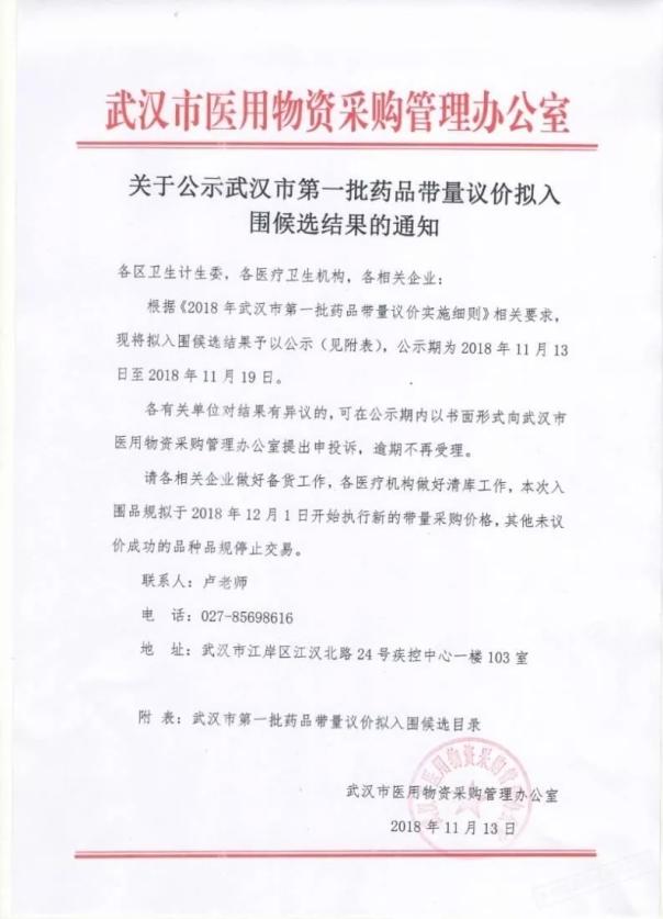 11月13日,武汉市医用物资采购管理办公室发布《关于公示武汉市第一批药品带量议价拟入围候选结果的通知》(以下简称《通知》)。
