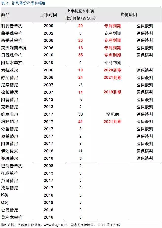 同时部分进口产品之所以降价,主要是因为专利悬崖,真正有影响的是相应品种仿制药的预期。譬如:受到贝达药业埃克替尼竞争,阿斯利康的吉非替尼(易瑞沙)从上市初的530元/片,逐渐下降到228元/片。受到康弘药业康柏西普竞争,诺华的雷珠单抗从上市初的9725元/支,逐渐下降到5700元/支。