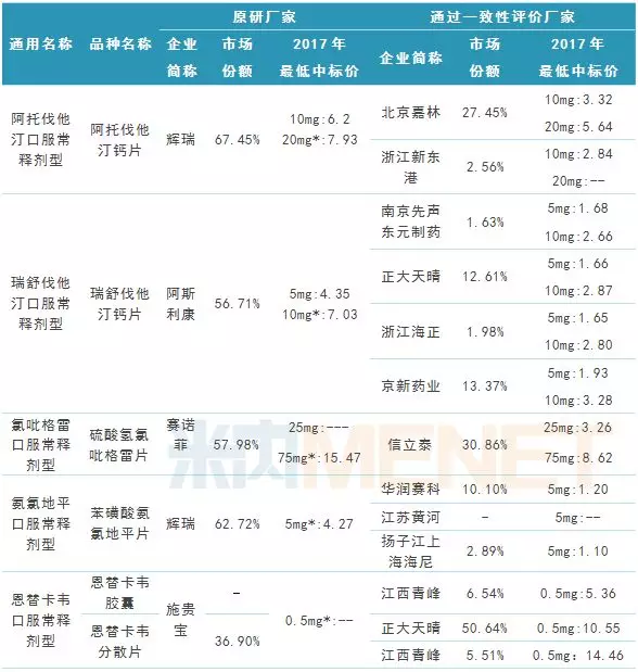 据米内网数据,31个通用名药品中,有5个药品在2017年中国公立医疗机构终端的销售额超过50亿元,分别为阿托伐他汀、瑞舒伐他汀、氯吡格雷、氨氯地平以及恩替卡韦。由于这5大品种原研厂家的市场份额均未达到90%以上,且其2017年全国最低中标价格平均在仿制药2倍左右,所以假设原研厂家放弃竞标,只考虑仿制药企业的竞争情况。根据正式文件,本次带量采购预中选及拟中选品种的确定规格包括: