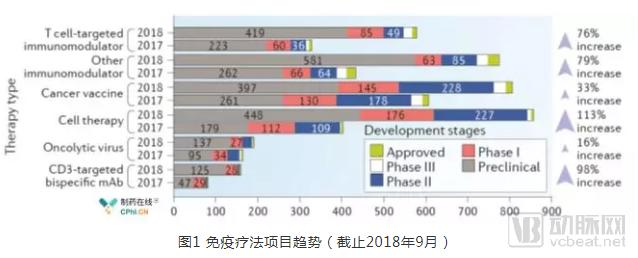 10月19日,纽约癌症研究所(CRI,Cancer Research Institute)再次公布《全球肿瘤免疫治疗发展趋势》调查报告,发表于《Nature Reviews Drug Discovery》期刊。在1年内,肿瘤免疫治疗全球项目数增加67%,靶点数增加50%,有临床开发项目的企业与机构数增加42%,肿瘤免疫治疗蓬勃发展。