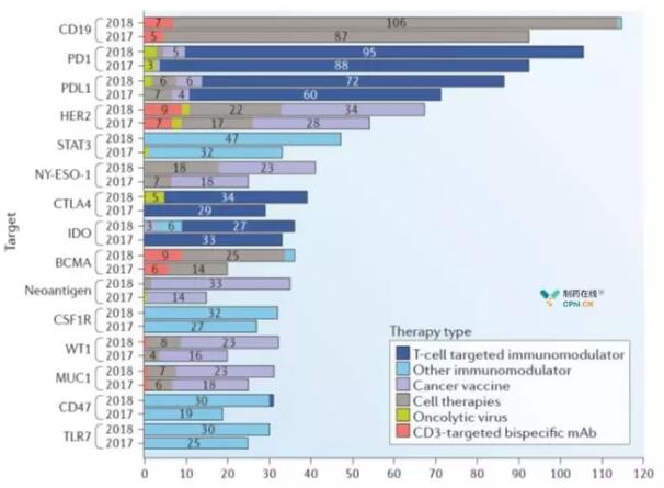 目前全球肿瘤免疫治疗项目中有417个靶点。过去一年,免疫治疗靶点数增加50%(附表)。有趣的是,2017年一半的研发项目集中在前23个靶点,但2018年,一半的研发项目集中在前48个热门靶点(附表)。通常,一个靶点有药物获批,相应的研发项目数将会减少(图2)。例如,尽管2018年细胞疗法数量增加了113%,但CD19靶向细胞疗法仅增加了37%。