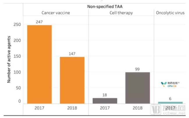 相反,靶向新抗原的药物(通过个体患者肿瘤的生物信息学分析确定的靶标)的在研数量在1年内增加了133%。肿瘤免疫治疗靶点数量的增加可能导致未来更多免疫疗法获批。值得注意的是,非特异性肿瘤相关抗原(TAA)药物实际数量是减少的,这表明该领域正朝着更精确的方向发展(图3)。