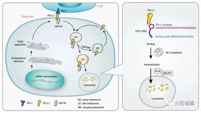 (2)溶酶体分选序列:位于HIP1R第966至979位间的氨基酸序列。这条具备“LL或LI”氨基酸序列的溶酶体分选序列负责把PD-L1定向转运进入溶酶体。该论文中描述到HIP1R通过与AP复合物结合将PD-L1运送到溶酶体表面,并依赖ESCRT复合物使PD-L1进入多囊体(MVB)和溶酶体中进行降解。