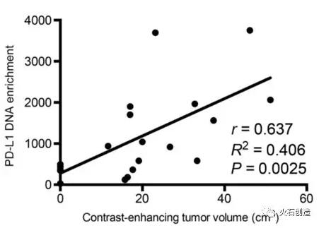 图3 PD-L1 DNA量与胶质母细胞瘤体积存在正相关关系