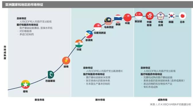 由于亚洲不同国家和地区之间的经济发展水平差异巨大,所以该地区情况非常复杂。很多因素都会影响本地区的增长潜力,比如,人口水平和市场成熟度、仿制药和生物类似药的普及程度、医疗改革和成本控制的解决方案、医疗支付方式(患者自费比例)等。