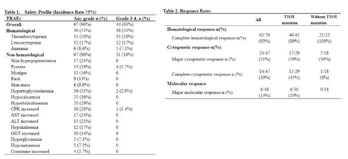 本次在ASH大会上公布的最新数据表明,HQP1351具有良好的耐受性,没有患者由于治疗相关的副作用(TRAE)退出临床试验。而在疗效的评估上,在3个治疗周期内,有65名患者(占93%)取得了血液病学的完全缓解(CHR)。而在接受了3个治疗周期及以上的47名患者中,有24名(占51%)取得了主要的细胞遗传学缓解(MCyR)。