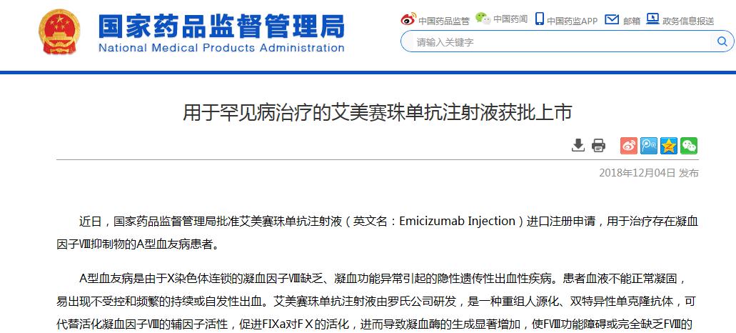 今日(12月4日),罗氏宣布舒友立乐®(英文商品名: HEMLIBRA®,化学通用名:艾美赛珠单抗)于日前正式获得国家药品监督管理局(NMPA)的批准,用于存在凝血因子VIII抑制物的A型血友病(先天性凝血因子VIII缺乏)成人和儿童患者的常规预防性治疗,以防止出血或降低出血发生的频率,这也是目前首个可每周一次进行皮下注射的预防性治疗药物。