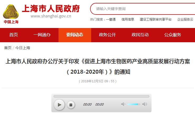 12月5日,上海市人民政府网站发布了《促进上海市生物医药产业高质量发展行动方案(2018-2020年)》,该文件由上海市科委和市政府办公厅共同牵头制定。